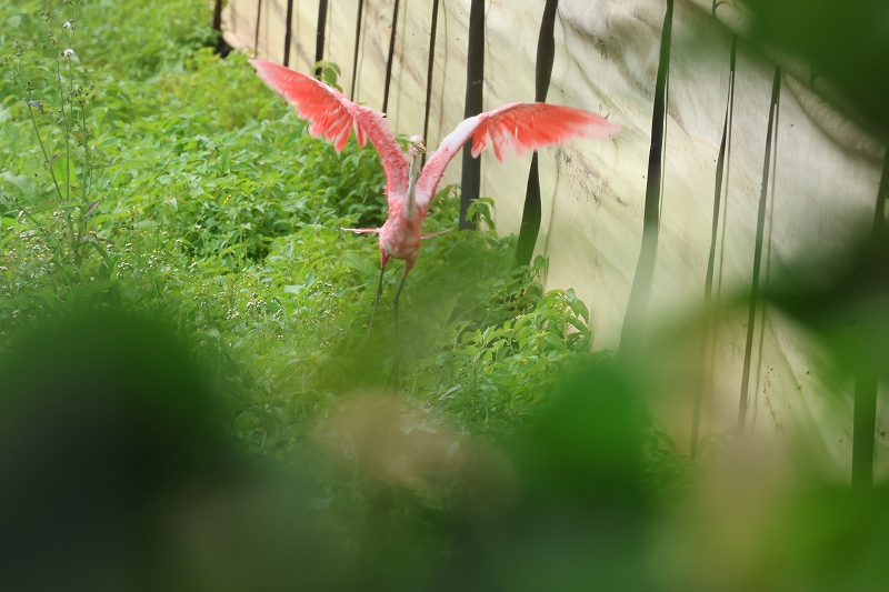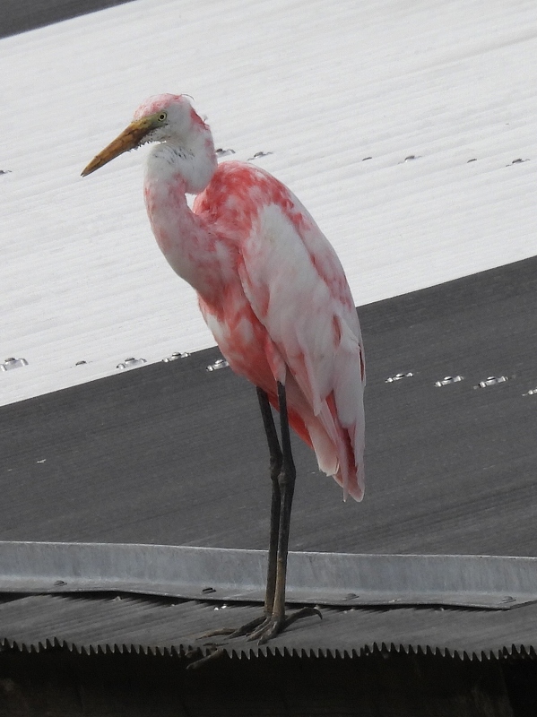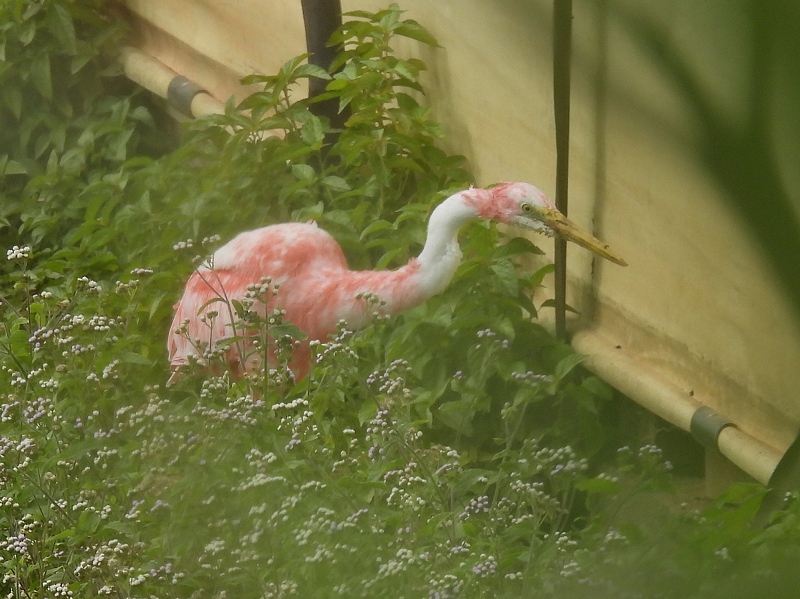 国頭村にてアマミヤマシギのGPS追跡調査。調査は夜間なので、昼間は越冬サシバを探していると、我地の豚舎周辺でピンク色の大きな鳥が飛び立った。鳥は一瞬のうちに豚舎の陰に下りて見失ってしまったが、日本の鳥ではちょっと思いつかない鮮やかなショッキングピンクが網膜に残像として残っており、篭脱けのフラミンゴ、あるいはベニヘラサギ?と頭の中に疑問符が浮かぶ。木々の間を透かして見ると、豚舎と豚舎の間の草地にピンク色の鳥が見えた。よく見てみると、なんと不思議なことにダイサギではないか。どういうことだろう? 人為的に染色したようにも見えないし、だとすれば自然現象ということになる。フラミンゴのピンク色は餌由来だが、シラサギ類でこんな事例は寡聞にして聞いたことがない。遺伝的な原因なのだろうか。謎のピンクダイサギの正体はいったい?